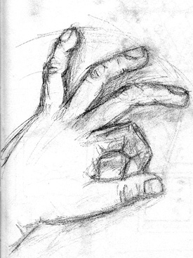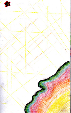 | This is just a sketch of my hand done in pencil. It was neat to watch it take form with the more marks you made. It's kind of smudgy but it does have a defined shape. | This is my inspiration, someone searching for all the anserws. A silloette with a single star and a network of lines to create depth. This was all done in coloured pencils. |