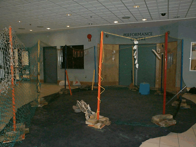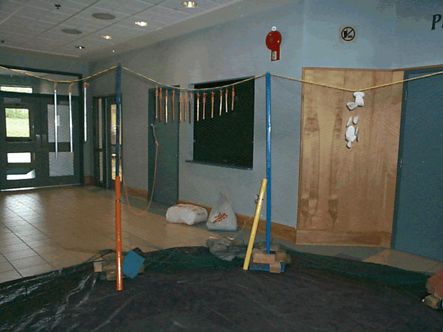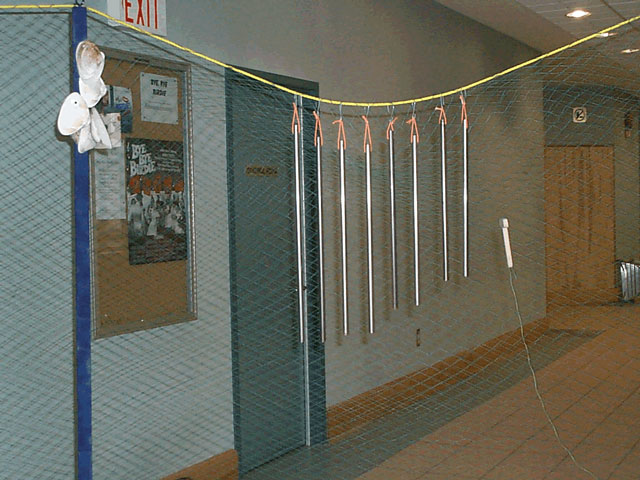 The project I have decided to create is a sound weir. This would be a small construction whose purpose was to be an interactive musical instrument or collection of instruments. The purpose of this space would be to cause a creative play reaction in the audience. Possibly it could be set up in an environment like an office building or a sidewalk or a school hall way, where it would cause a strong reaction. Basically it is a fish weir structure, with supporting two by four posts and a network of nets to support the instruments and to guide people. The structure would funnel the people entering into the structure and guide their progress, and also the spiral shape would cause people passing by to react to its positioning, moving around it.